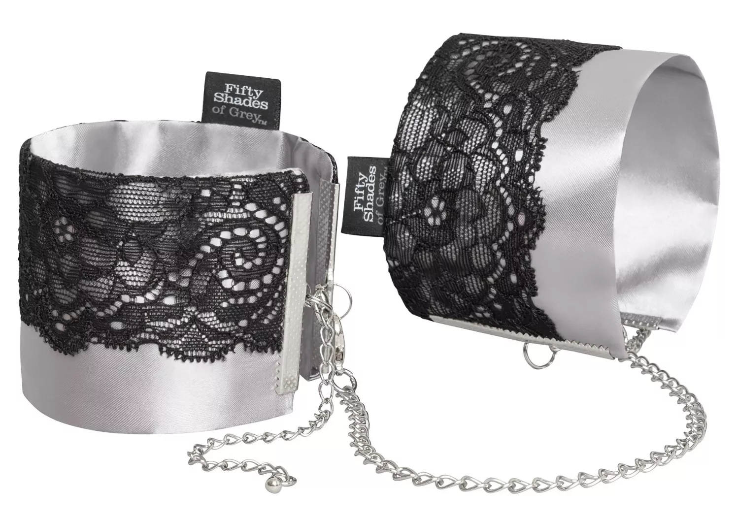 Érzéki, ezüst színű szatén bilincs pár, finom, fekete csipke díszítésekkel.