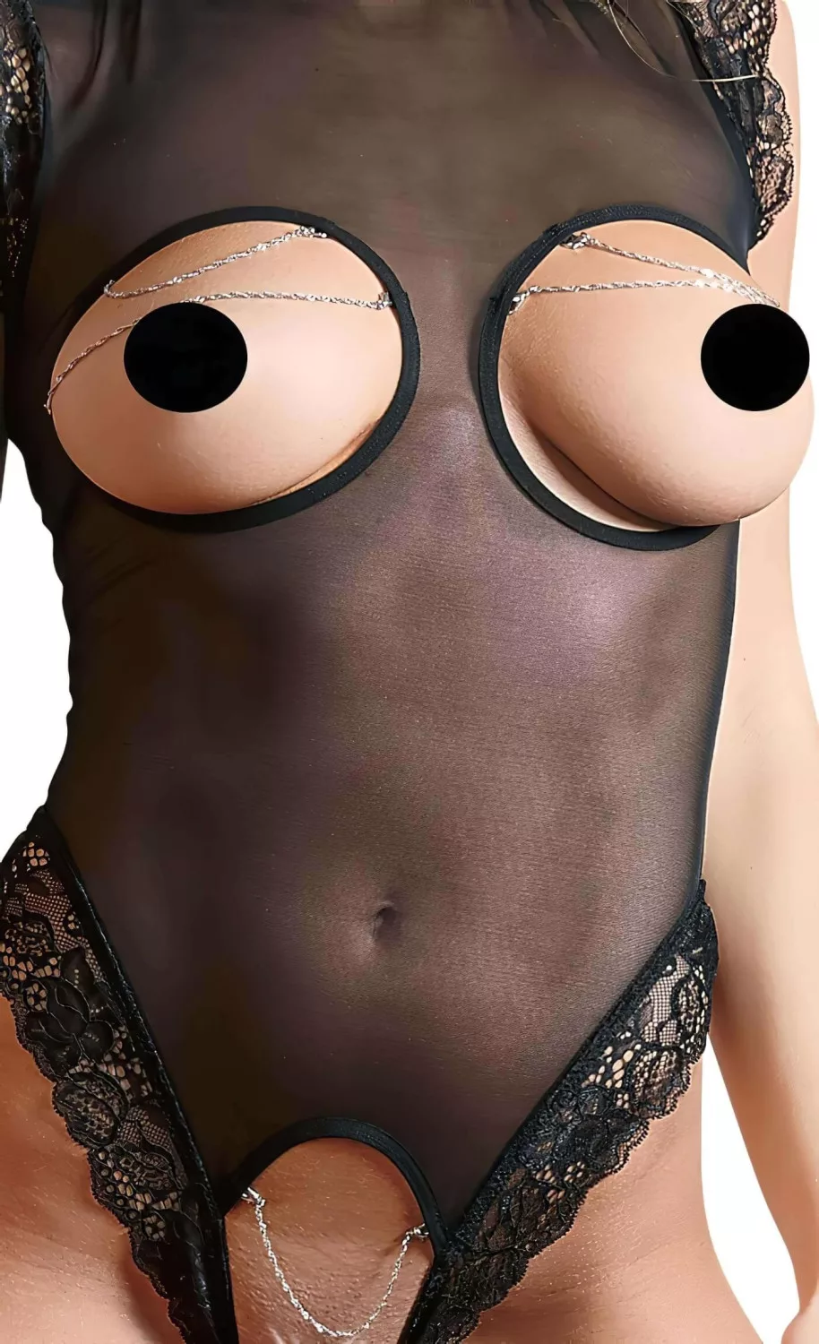 Ez a különleges nyitott body egyszerre elegáns és vadítóan erotikus. A csipkés részletek nőies kifinomultságot adnak, míg az átlátszó anyag és a levehető láncos díszek gondoskodnak a felejthetetlen élményről.