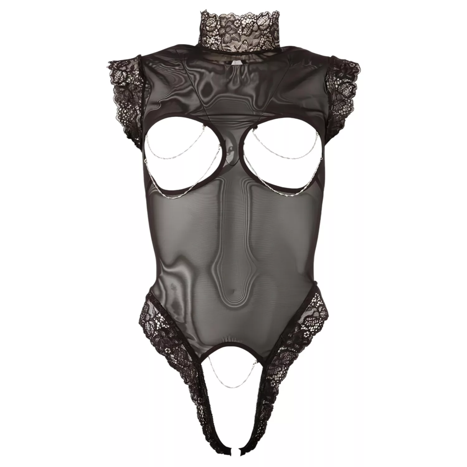 Ez a különleges nyitott body egyszerre elegáns és vadítóan erotikus. A csipkés részletek nőies kifinomultságot adnak, míg az átlátszó anyag és a levehető láncos díszek gondoskodnak a felejthetetlen élményről.