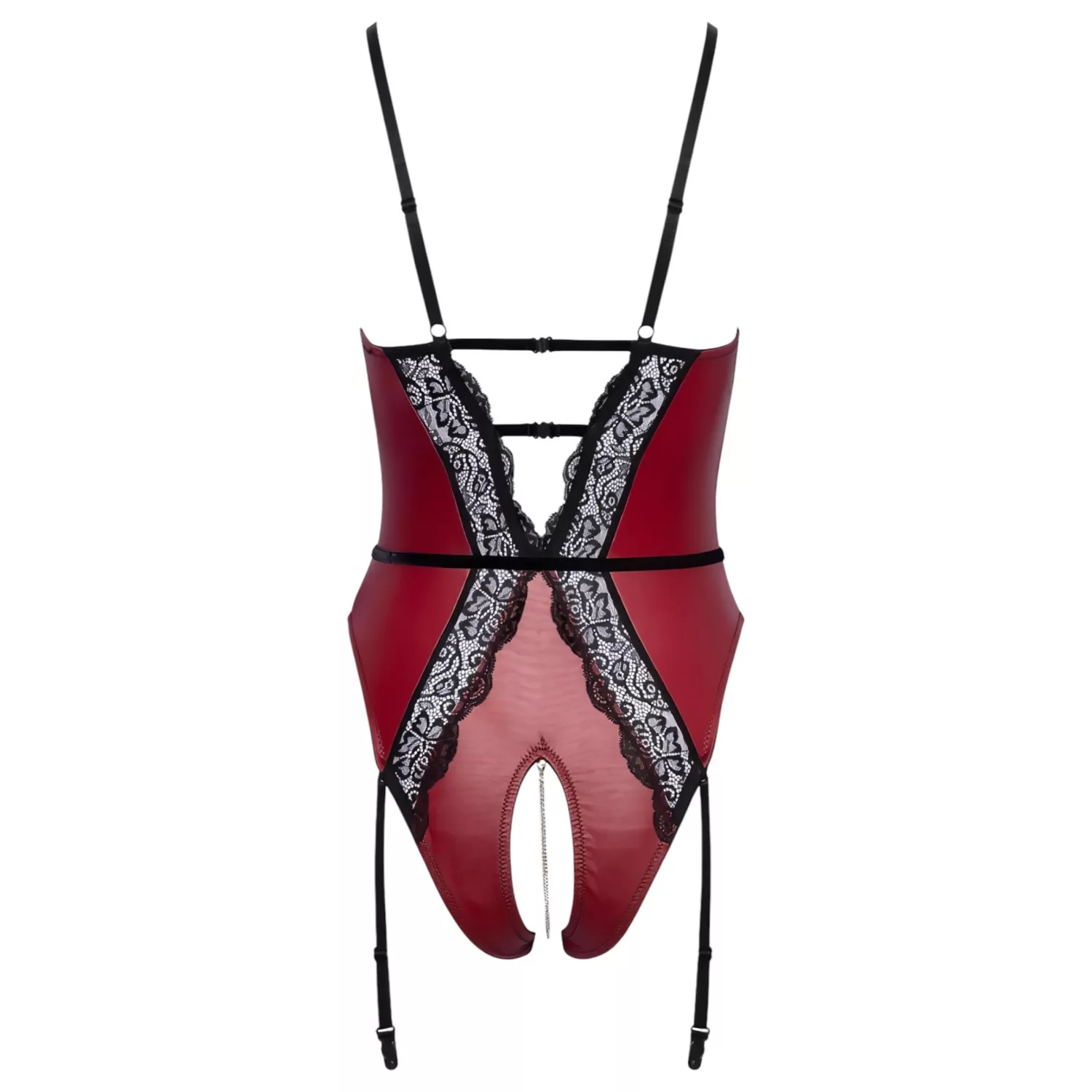 A vörös és a fekete őrjítő kombinációjával készült nyitott body, mely a strasszköves részleteivel válik igazán ellenállhatatlanná – Abierta Fina nyitott body láncos díszítéssel