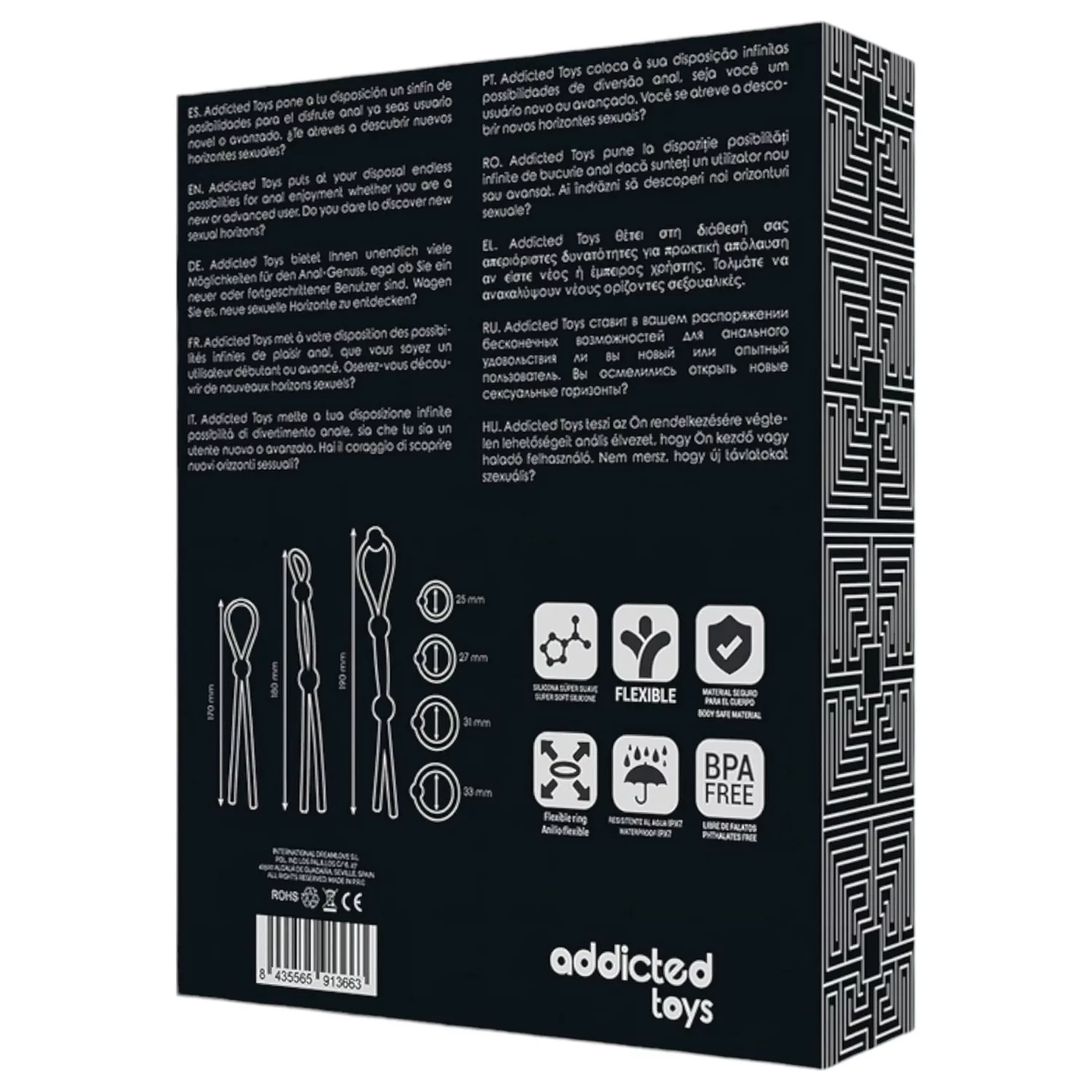 • 4 darab különböző méretű péniszgyűrű (belső átmérők: 2,5, 2,7, 3,1 és 3,3 cm)