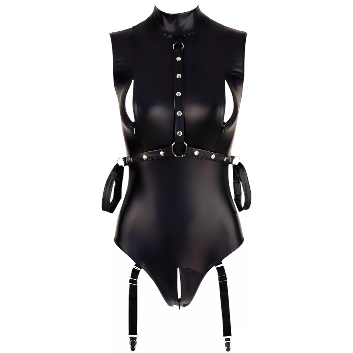 • 1 darab fényes, bőrhatású harisnyatartós body beépített kézkötözőkkel