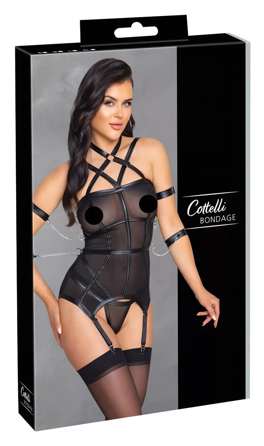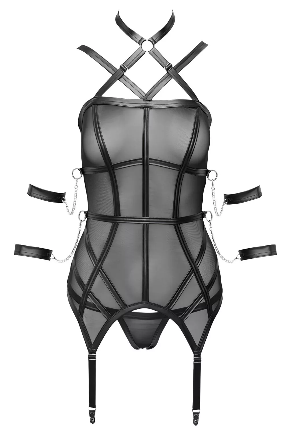 Kifinomult, szexi fehérnemű, amely alig takar valamit, ráadásul a kéz- és karrögzítőkkel kiváló a BDSM szerelmeseinek is!