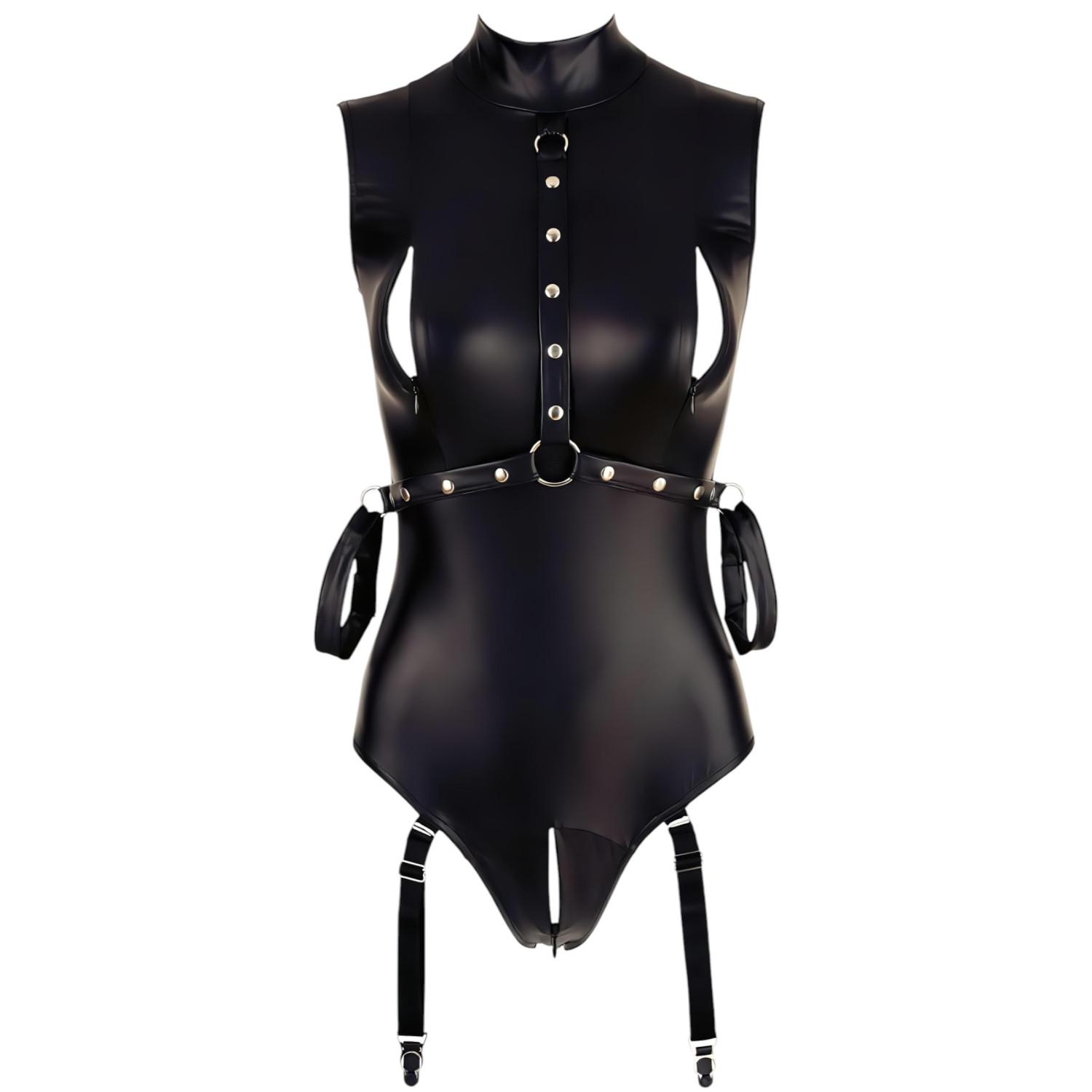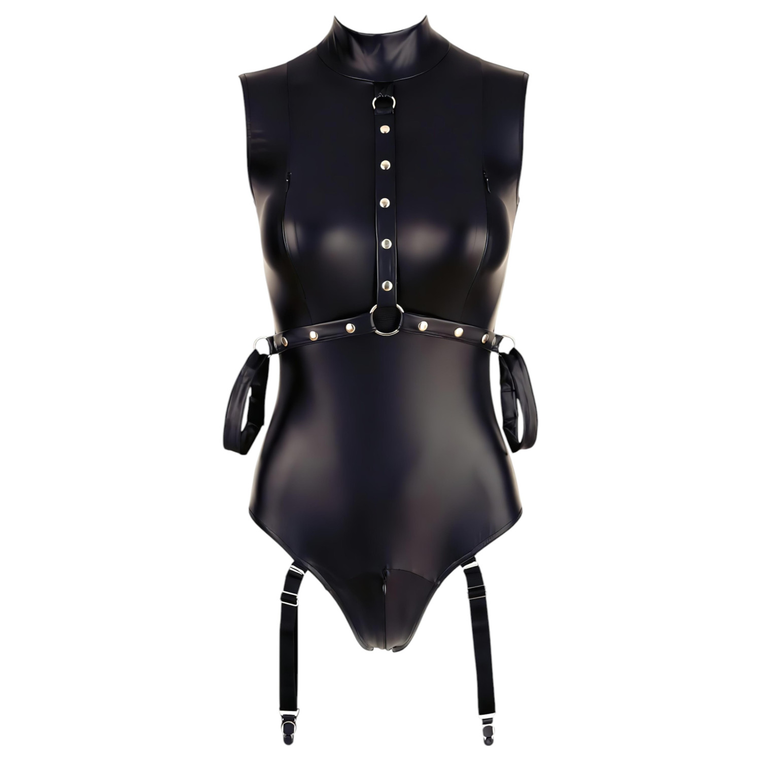 • 1 darab fényes, bőrhatású harisnyatartós body beépített kézkötözőkkel