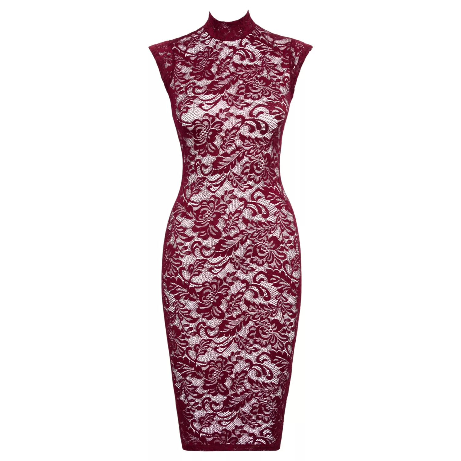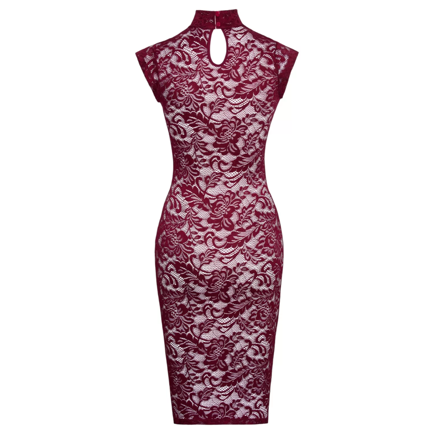 Ez a térdig érő, ujjatlan ruha különleges Bordeaux vörös csipkéből készült, amely finoman simul a testre és látványosan hangsúlyozza a nőies sziluettet. A puha, rugalmas anyag kényelmes mozgást és tökéletes illeszkedést nyújt, így ideális választás romantikus estékre, csábításhoz vagy elegáns fehérneműként is. A gallér mögötti gombos zárás tovább fokozza az exkluzív megjelenést.