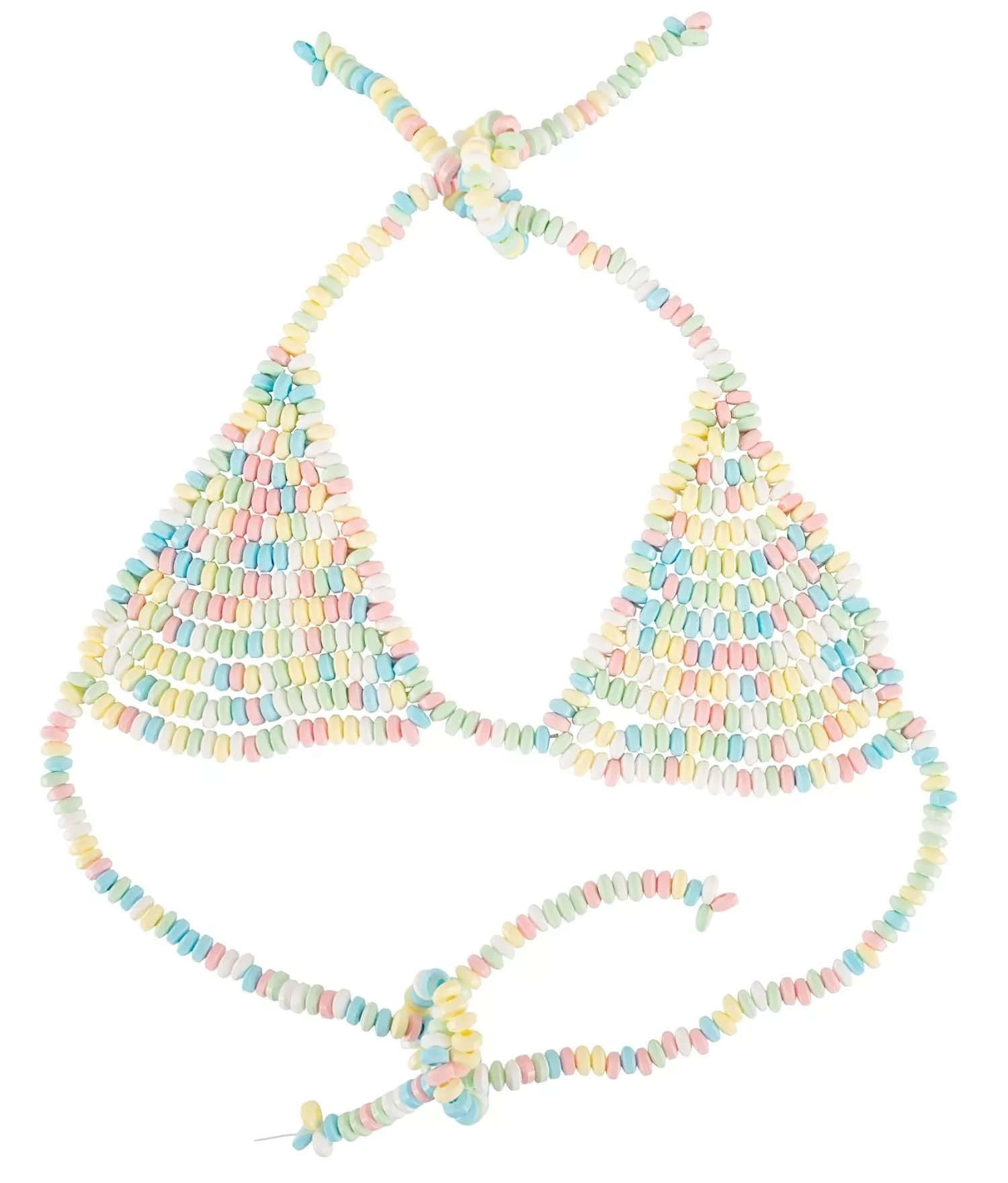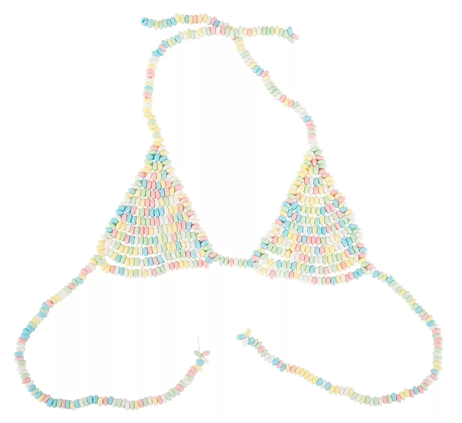 • Közkedvelt, színes cukorka gyöngyökből fűzött érzéki melltartó, amely szórakoztató és vonzó megjelenést biztosít.