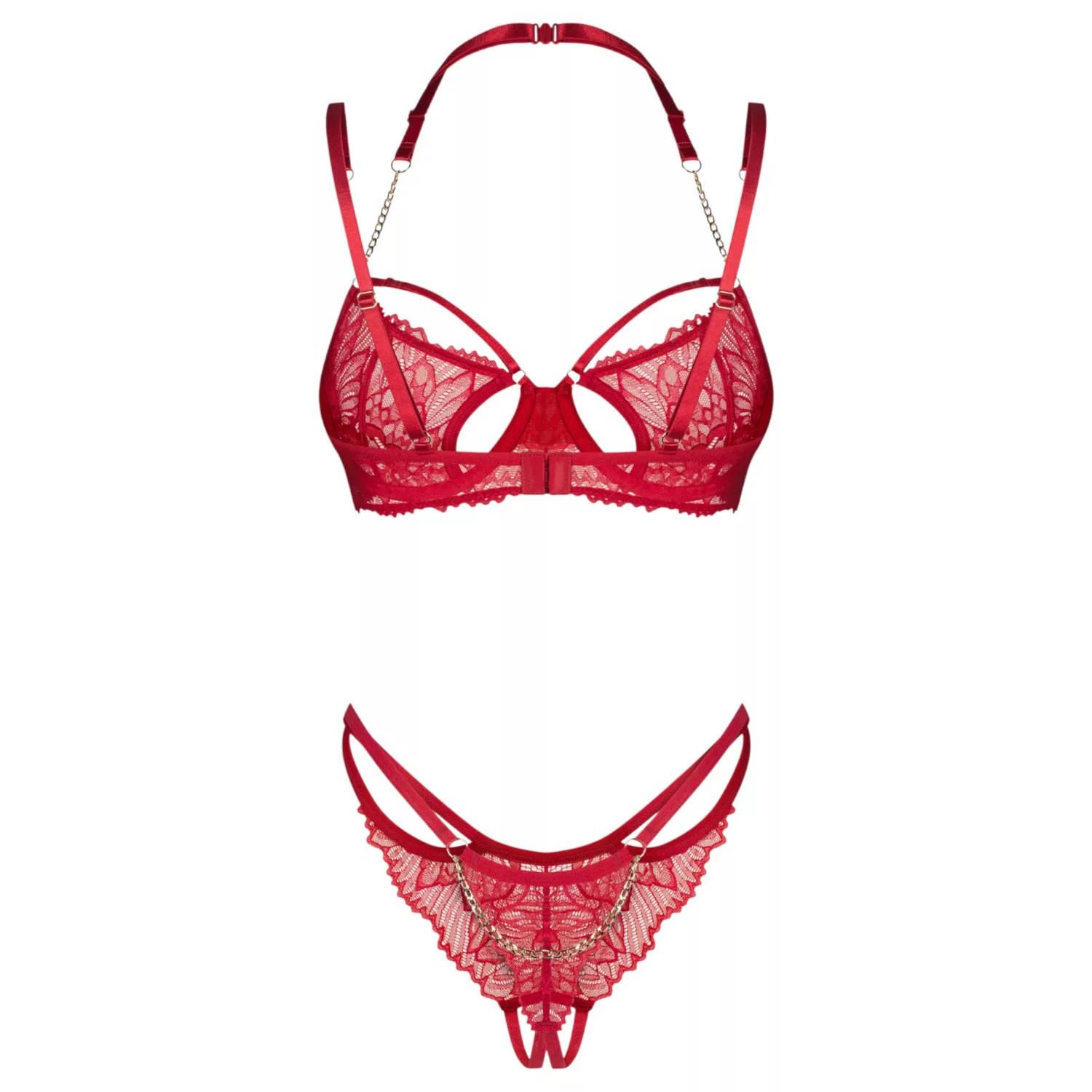 Ez a szexi fehérnemű szett kiemeli a nőiességet és a vonzerőt minden részletében. A piros csipke romantikus és érzéki, míg a kivágások és a pántmegoldások merész, provokatív megjelenést biztosítanak. Ideális választás különleges alkalmakra vagy bármikor, amikor szeretnél igazán csábító lenni.