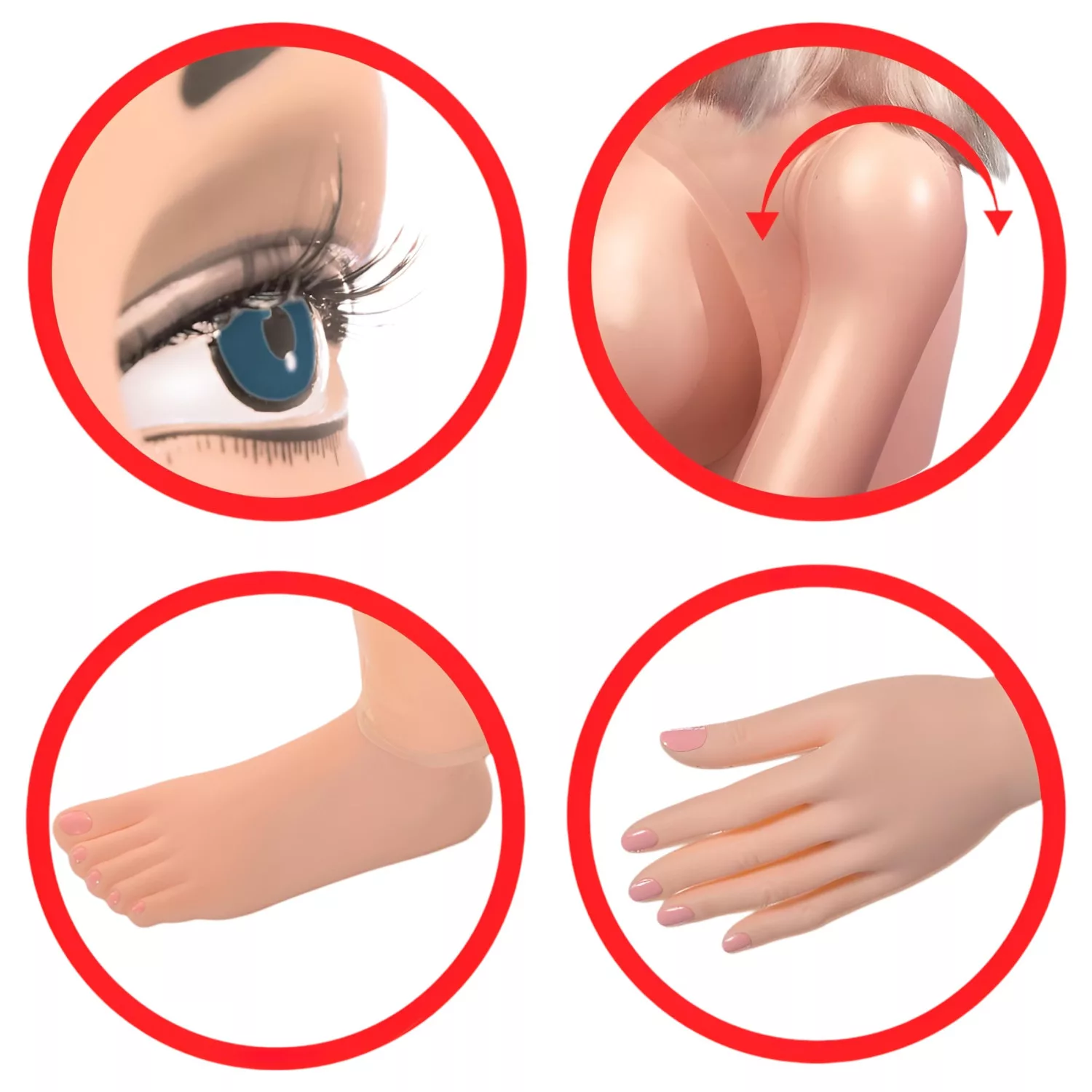• Életnagyságú méret, kerek és telt mellek, forgatható karok