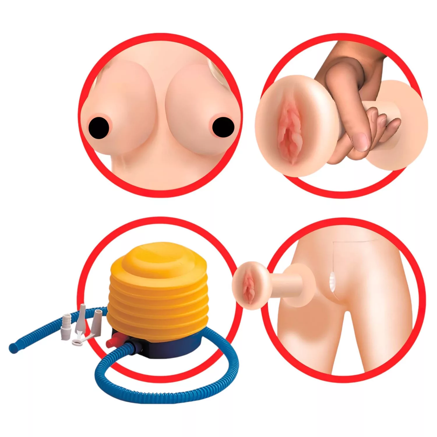 Életnagyságúra felfújható, formált, 3D arccal készült, hosszú szőke hajjal, hívogató kéjnyílásokkal.