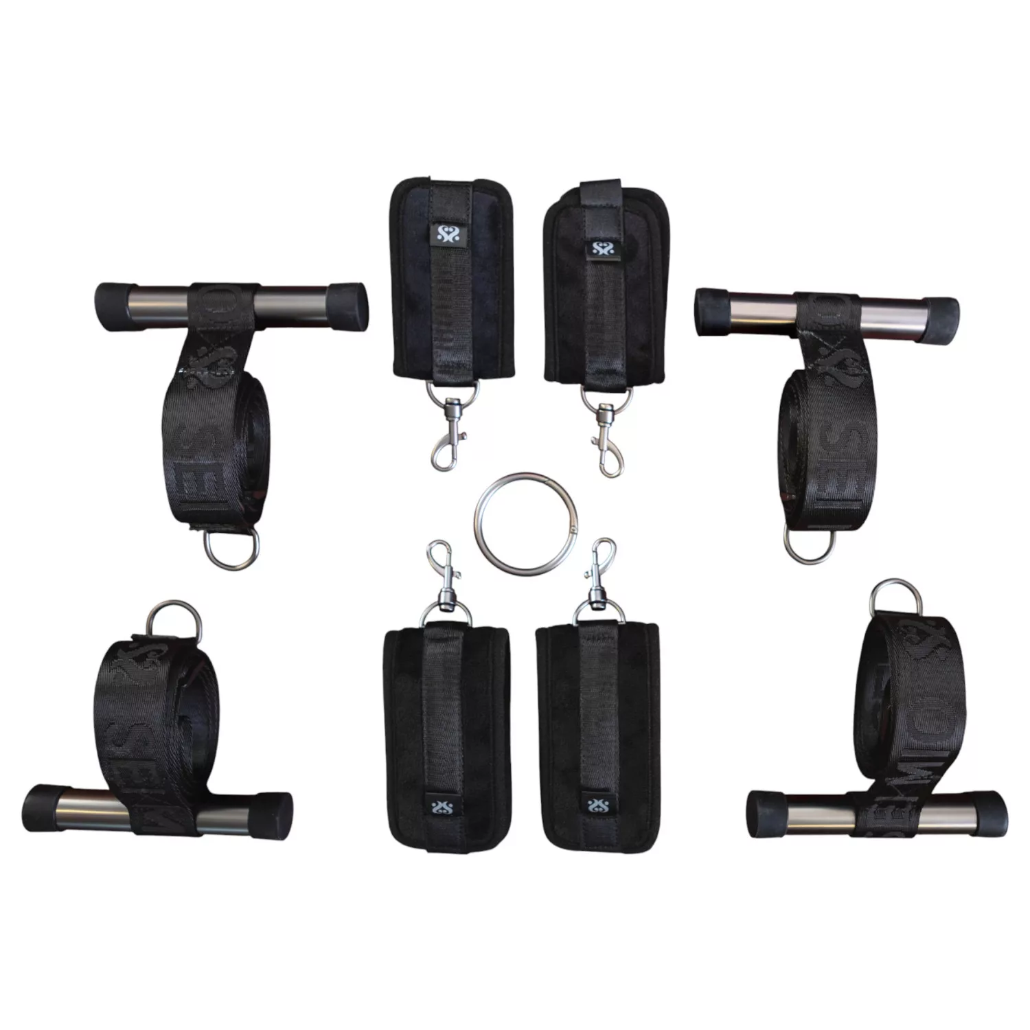 Nyisd ki az ajtót, helyezd a hevederrendszer „felső kampóját” az ajtó tetejére, a „alsó kampót” az ajtó aljára – így zárd be az ajtót. Ellenőrizd, hogy a hevederek feszesek-e, majd rögzítsd a partner csuklóit és bokáit a D-gyűrűknél. Állítsd be a kívánt pozíciót, hogy stabilan és biztonságosan maradjon.