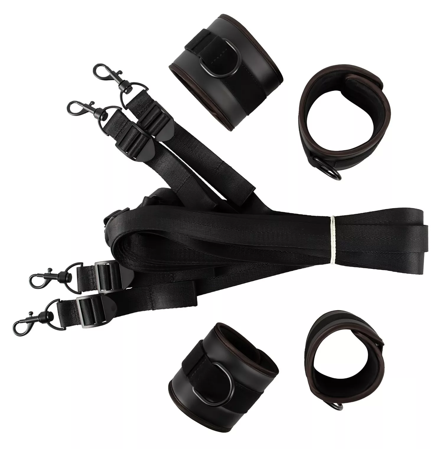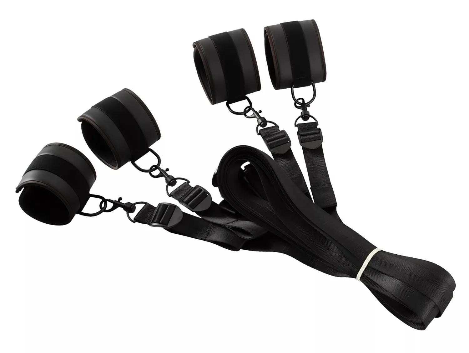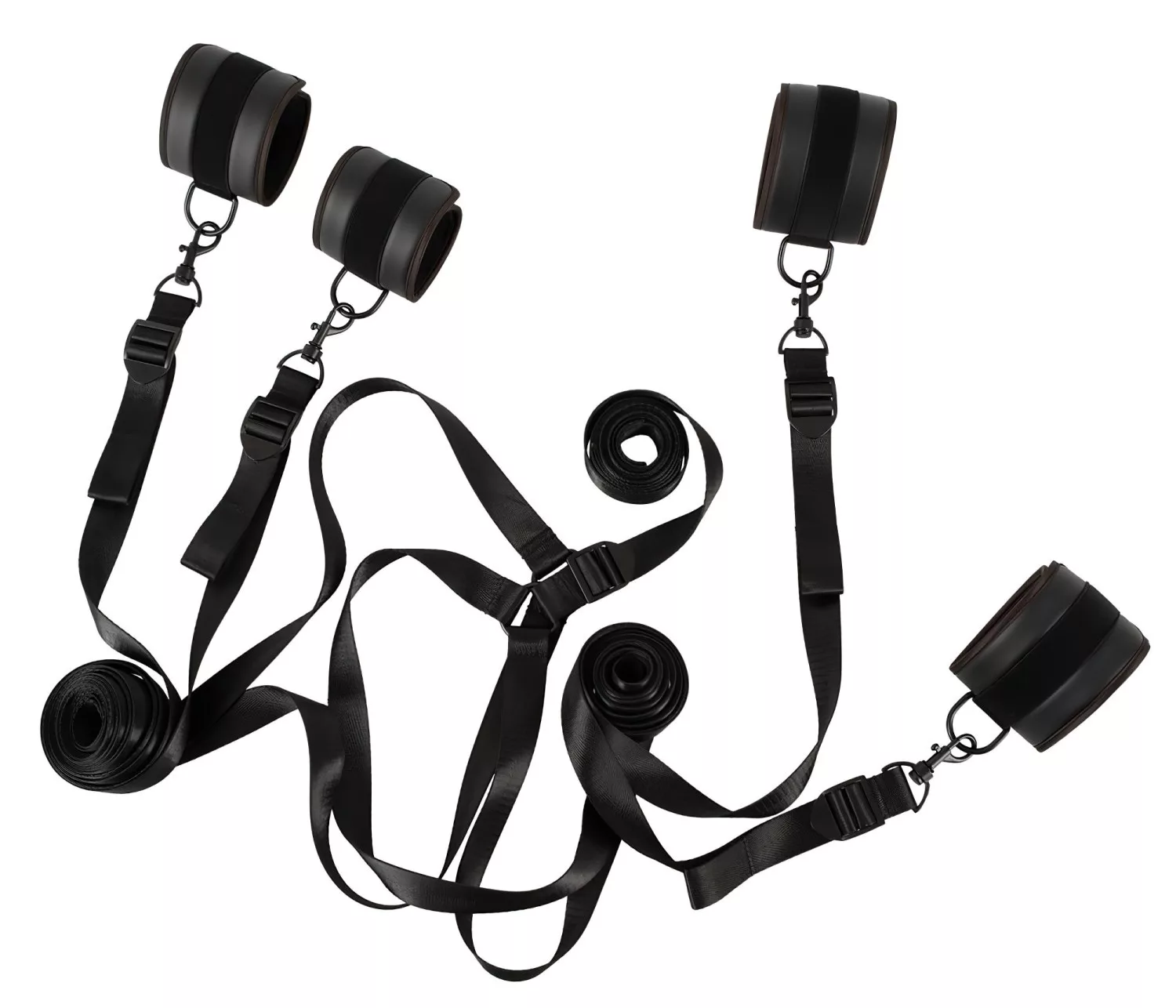 Vezesd át a hosszú kötözőt a matrac/ágy rácsa alatt, vele párhuzamosan, majd 4 kötözőpántot húzd ki úgy, hogy a matrac felett legyenek, ugyanis ehhez kerülnek karabinerrel csatlakoztatásra a bilincsek. Csatlakoztasd hozzájuk a csukló- és bokapántokat és már kezdődhet is a játék!