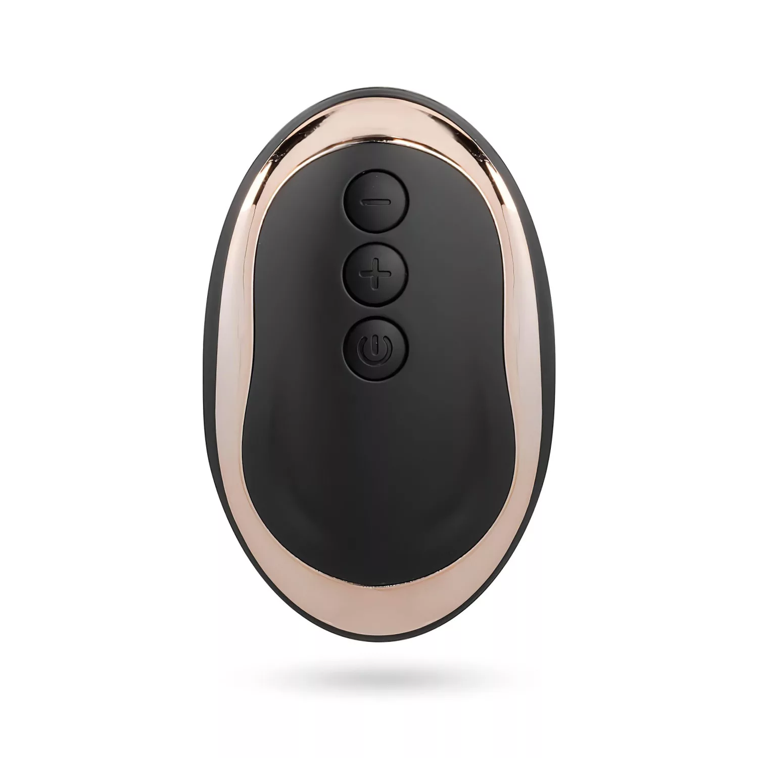 • Rádiós vibrációs tojás: szilárd alapon bőrbarát szilikon borítással, bordázott stimuláló felszín, 3 gombos vezérlés, állítható rezgéserősség, teljes hossz: 9 x 4 x 3 cm, távvezérlő mérete: 6 x 3,5 x 1,5 cm, fekete színben, arany színű csillogó berakásokkal, anyaga: ABS, Szilikon.