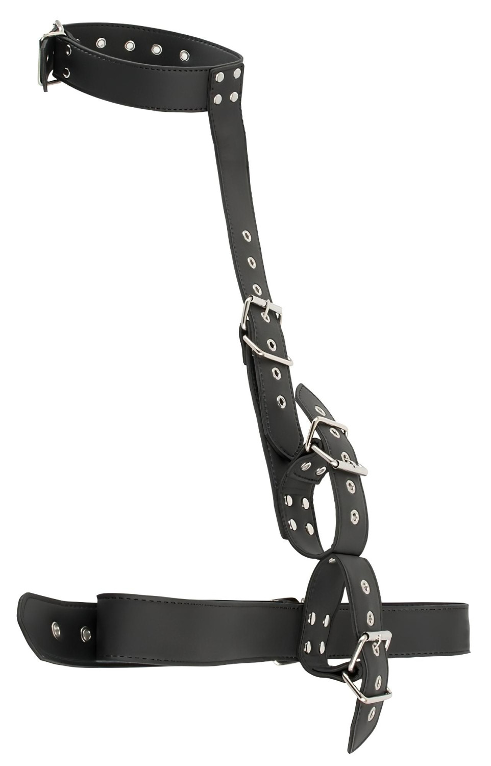 • Először a derékpántot rögzítsd annak megfelelően, hogy a kezeket előre, vagy a hát mögé szeretnéd lebilincselni. Ezt követően állítsd be az ideális hosszt a nyakpánthoz, majd végül rögzítsd a kezeket a csuklónál.